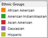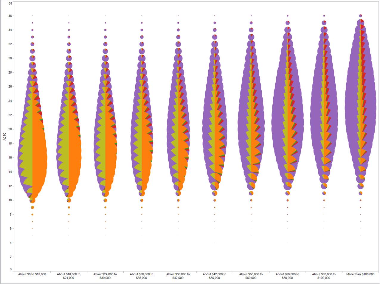 I created the y-axis as the ACT composite score, and then used self-reported income bands as the x-axis. Both are discrete, categorical values, even though ACT is numeric. ACT increases bottom-to-top, and income bands increase left-to-right. At the intersection of each variable is a pie chart, sized by the number of students in that group, and colored by ethnicity, using this legend: