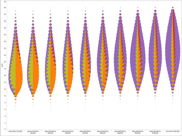 I call the result a feather chart, for obvious reasons, and while it’s probably not very practical (and while lots of people hate pie charts for good reasons), it’s very instructive in this instance. We’re looking at overall trends of 11 million records: We don’t need to know in this instance that 25 ACT with $80K of income is slightly larger or smaller than 23 ACT with $100K of income.