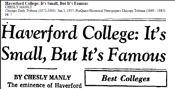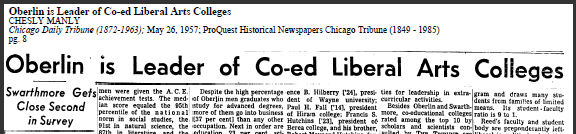 Lest you think this is new, let’s roll back the clock to 1957. May 26, 1957, to be exact: Chesly Manly writes his own rankings, based on informal surveys “of scholars and scientists” in the Chicago Daily Tribune, and names Oberlin as the best Co-ed Liberal-Arts College. (I’d like to thank my colleague, Jon McGee for sharing these with me.)