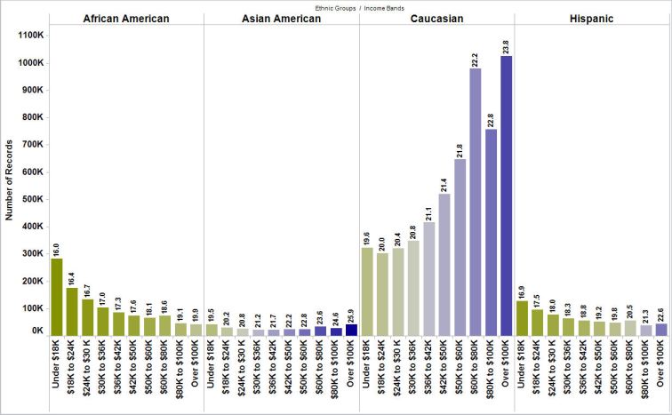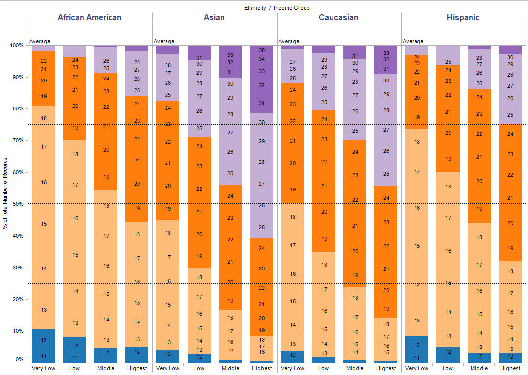 This, of course, fails to show the distribution; you get a sense of it, but it does give you some greater detail. What about distributions? Try this, and see if it makes the point, even though it’s impossible to compare the number of records in each group, even if you were to label them. These are grouped into a smaller number of income bands for clarity, and show stacked, 100% bars colored by groups of ACT Scores. Labels show individual scores, which are grouped by color for visual impression.