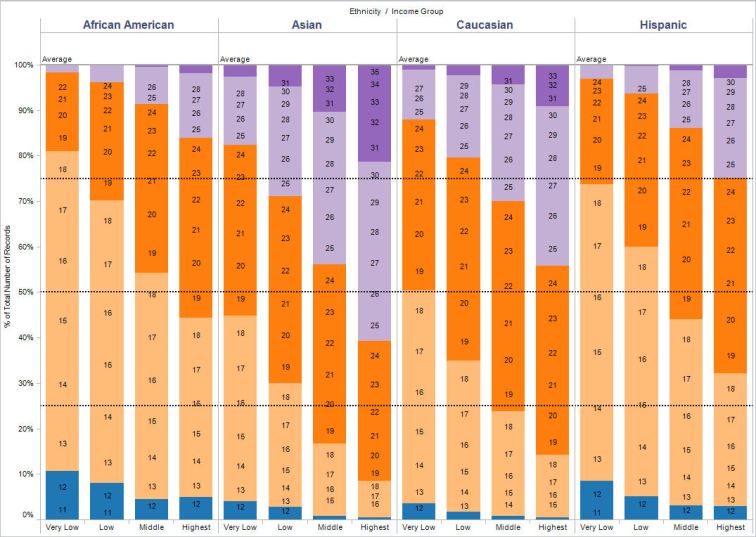 I’ve broken the data into four large groups by ethnicity and then into smaller groups by self-reported income. The length of the bar shows the number of records; the color of the bar shows the average ACT of the students in that group (dark gold is low, dark purple is high), as does the label. Better?