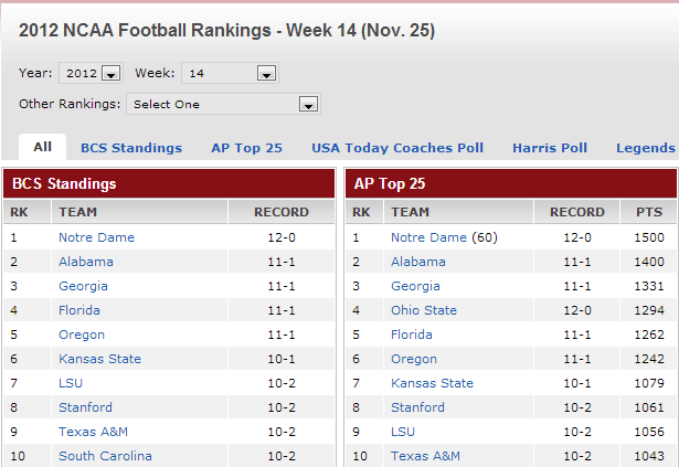 A recent article in USA Today lauded the ways in which Notre Dame football is Number 1 in graduation rates of its players. And of course, they’re now Number 1 in the AP Poll and BCS rankings for College Football, too, a rare accomplishment that seems to make the always-proud alumni base even more sanctimonious than usual. (Note: This link will be obsolete as games are played. Here’s a screenshot of it as of November 28, 2012.)