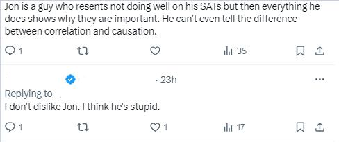 And yet, citing this research has not changed his mind. To which I reply, QED. Told ya so. Statistics don’t change the minds of people who think choosing one answer from the options presented makes you smart. I could do that easily.