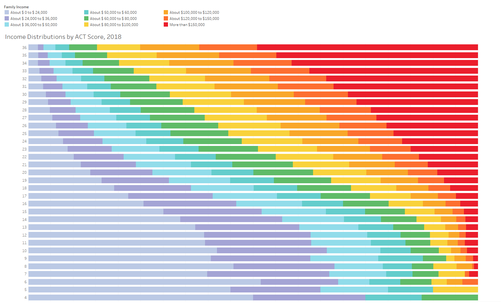 The comment about correlation and causation is almost certainly in reference to this chart I’ve posted several times, using data I extracted from the ACT software colleges used. Although it’s from 2018, this pattern held true over time; it’s not unique to this year. You can see that at every ACT Composite score, the probability of hitting that score increases with income. And it’s such a perfect stepwise progression, you’d have to think it was designed that way.