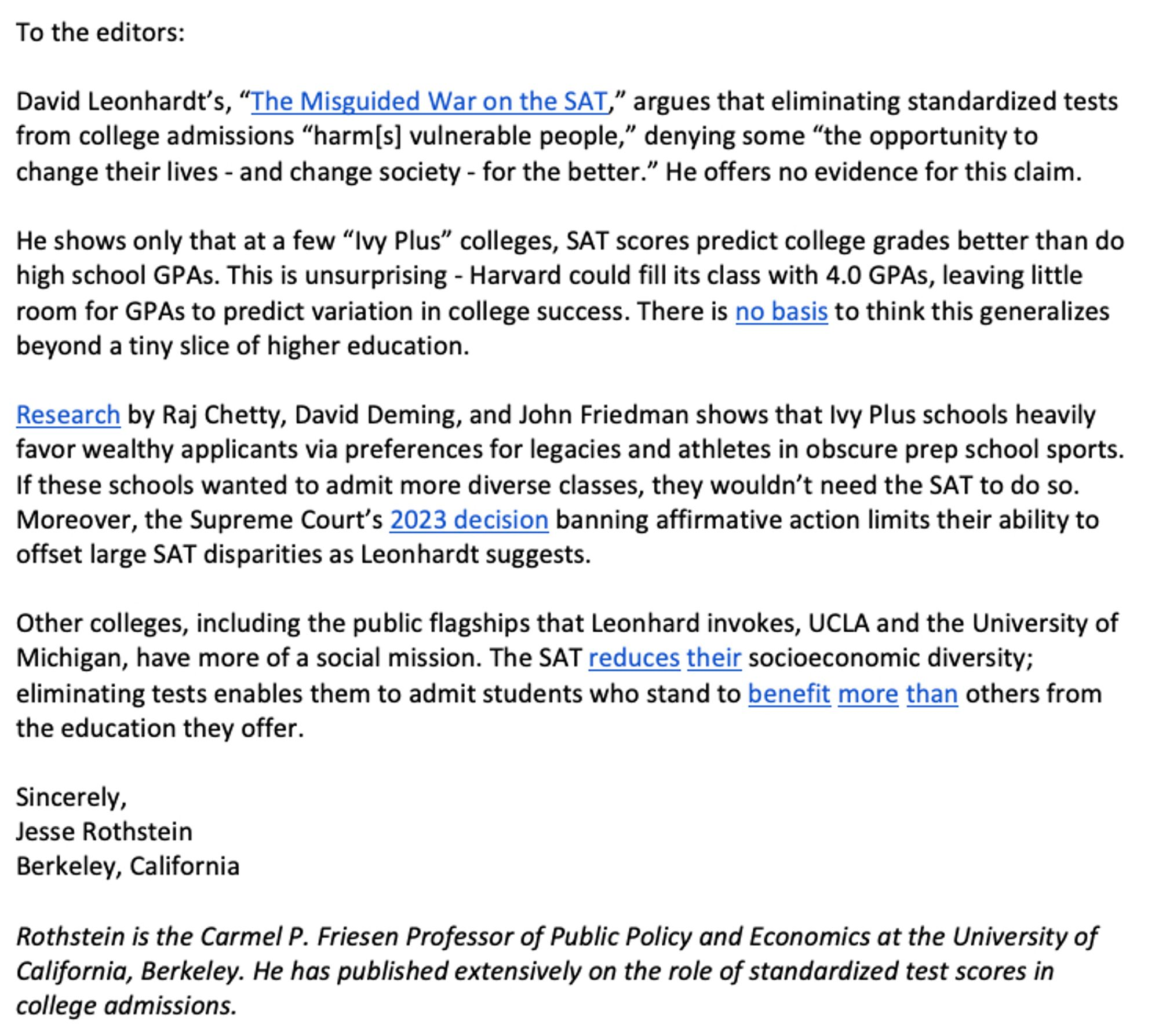 Of course, in my previous article, I cited this thread which contained statistics, and which tore apart the analysis in the Leonhardt article, and now Jesse Rothstein, also at Berkeley, has sent this letter to the Times: