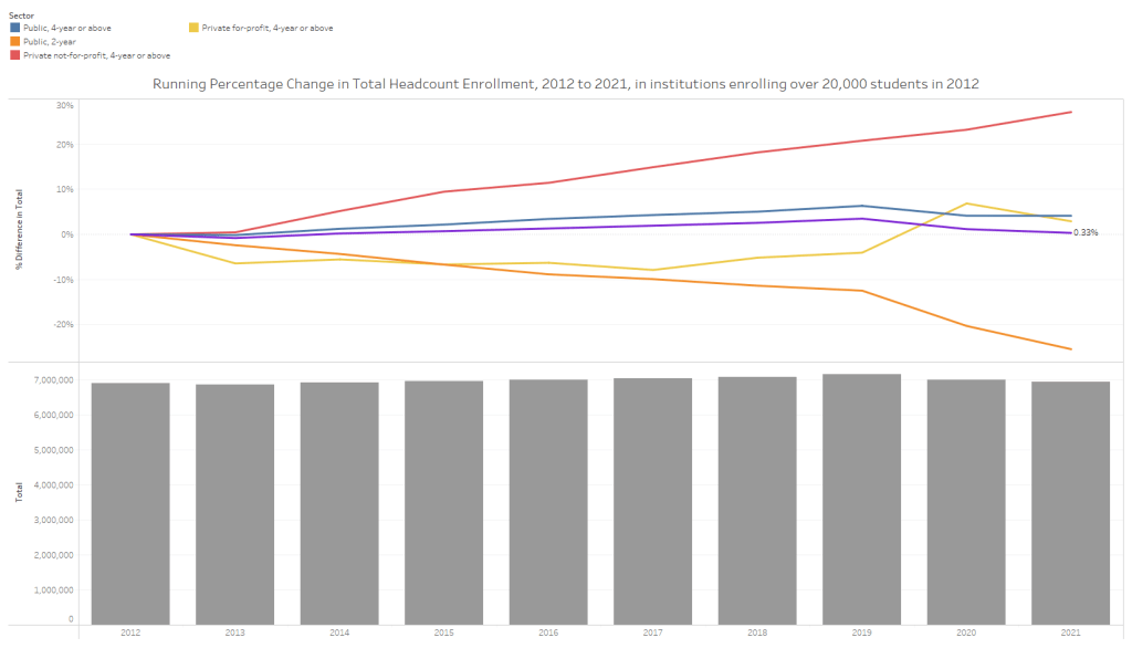 The total enrollment in these institutions increased over that time (albeit slightly), but all sectors other than community colleges increased more than that.