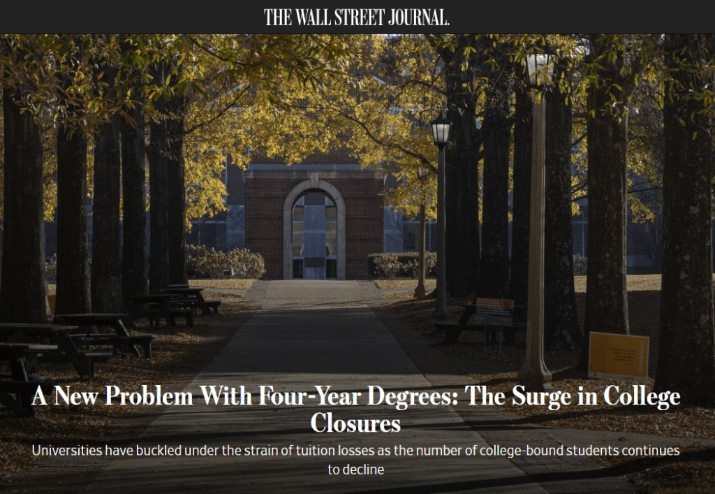 The Wall Street Journal, of course, always ready to celebrate the demise of any industry that doesn’t run on a McKinsey or Bain model, suggests doom and gloom ahead, if you believe it’s not already here, with this dire full-column bleed. We have a “surge” in college closings:
