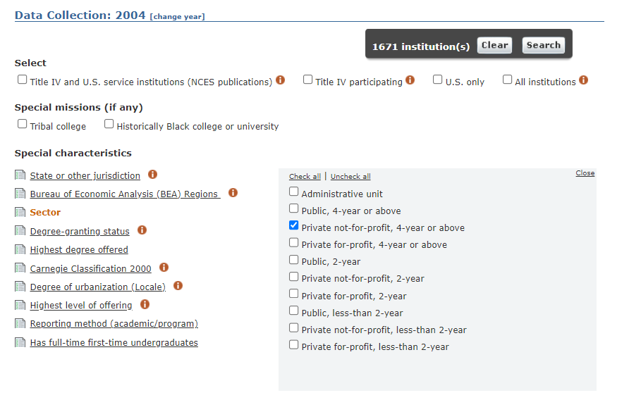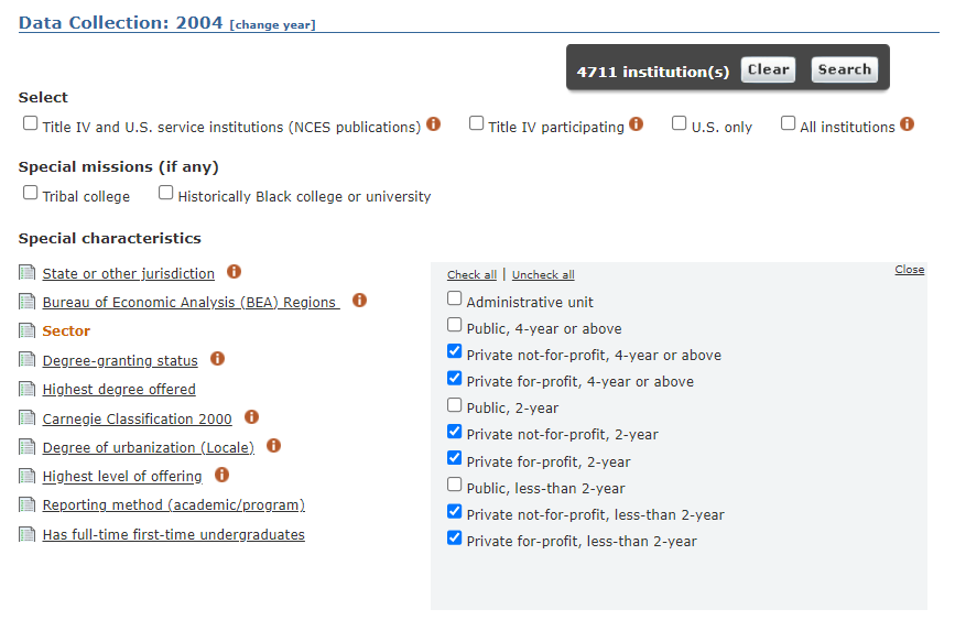 I have an email into SHEEO asking for this report or better yet, a list of the 500 schools, as my web search has been unsuccessful in turning it up. But I did go off to IPEDS to see if there is any chance this is true, as it seemed a bit off to me. Here’s what I found. In 2004, there were 1,671 such institutions.