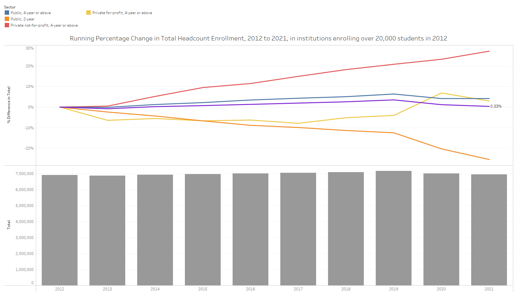 The total enrollment in these institutions increased over that time (albeit slightly), but all sectors other than community colleges increased more than that.