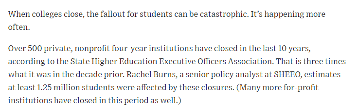 And by no means am I suggesting that traditional, private, not-for-profit colleges are not closing. They are, and as the Higher Ed Dive article rightly points out, very small institutions are most vulnerable, for the most part.
