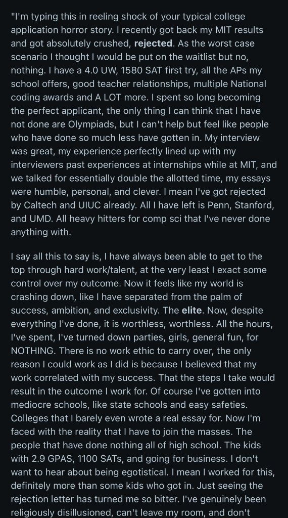 • It can have a positive collective effect on the mental health of our nation’s teenagers. In a more perfect world, a decrease in application numbers and an increase in reliance on test scores would mean this student would be able to enroll at MIT instead of your institution. Think of how good having them not enroll would be for your campus and for your students.